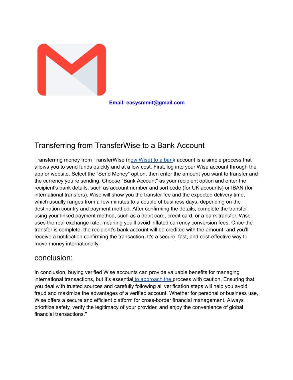 Email: easysmmit@gmail.com Transferring from TransferWise to a Bank Account Transferring money from TransferWise (now Wise) to a bank account is a simple process that allows you to send funds quickly and at a low cost. First, log into your Wise account through the app or website. Select the "Send Money" option, then enter the amount you want to transfer and the currency you’re sending. Choose "Bank Account" as your recipient option and enter the recipient's bank details, such as account number and sort code (for UK accounts) or IBAN (for international transfers). Wise will show you the transfer fee and the expected delivery time, which usually ranges from a few minutes to a couple of business days, depending on the destination country and payment method. After confirming the details, complete the transfer using your linked payment method, such as a debit card, credit card, or a bank transfer. Wise uses the real exchange rate, meaning you’ll avoid inflated currency conversion fees. Once the transfer is complete, the recipient’s bank account will be credited with the amount, and you’ll receive a notification confirming the transaction. It's a secure, fast, and cost-effective way to move money internationally. conclusion: In conclusion, buying verified Wise accounts can provide valuable benefits for managing international transactions, but it’s essential to approach the process with caution. Ensuring that you deal with trusted sources and carefully following all verification steps will help you avoid fraud and maximize the advantages of a verified account. Whether for personal or business use, Wise offers a secure and efficient platform for cross-border financial management. Always prioritize safety, verify the legitimacy of your provider, and enjoy the convenience of global financial transactions."