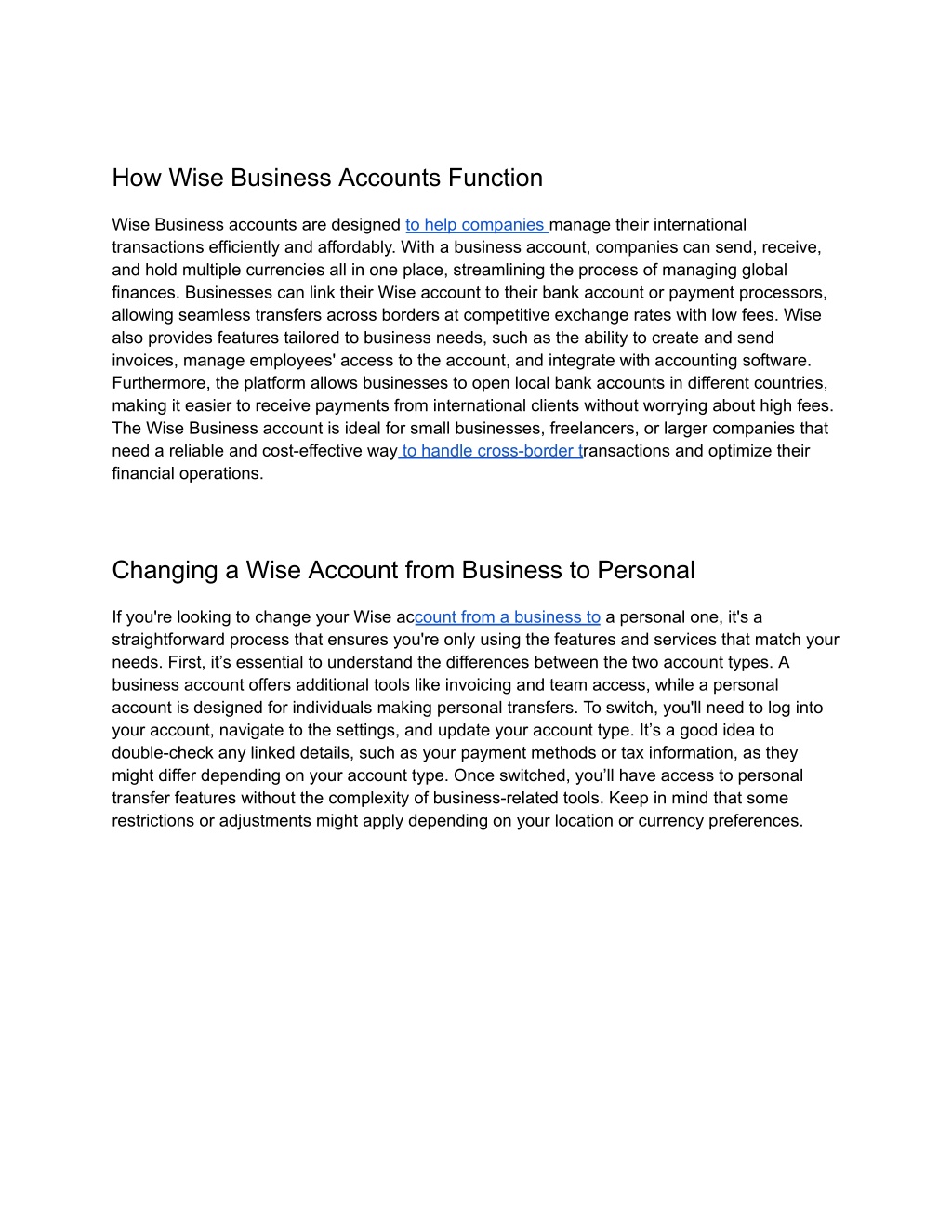 How Wise Business Accounts Function Wise Business accounts are designed to help companies manage their international transactions efficiently and affordably. With a business account, companies can send, receive, and hold multiple currencies all in one place, streamlining the process of managing global finances. Businesses can link their Wise account to their bank account or payment processors, allowing seamless transfers across borders at competitive exchange rates with low fees. Wise also provides features tailored to business needs, such as the ability to create and send invoices, manage employees' access to the account, and integrate with accounting software. Furthermore, the platform allows businesses to open local bank accounts in different countries, making it easier to receive payments from international clients without worrying about high fees. The Wise Business account is ideal for small businesses, freelancers, or larger companies that need a reliable and cost-effective way to handle cross-border transactions and optimize their financial operations. Changing a Wise Account from Business to Personal If you're looking to change your Wise account from a business to a personal one, it's a straightforward process that ensures you're only using the features and services that match your needs. First, it’s essential to understand the differences between the two account types. A business account offers additional tools like invoicing and team access, while a personal account is designed for individuals making personal transfers. To switch, you'll need to log into your account, navigate to the settings, and update your account type. It’s a good idea to double-check any linked details, such as your payment methods or tax information, as they might differ depending on your account type. Once switched, you’ll have access to personal transfer features without the complexity of business-related tools. Keep in mind that some restrictions or adjustments might apply depending on your location or currency preferences.