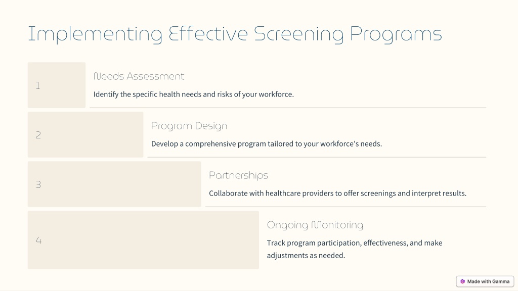 Implementing Effective Screening Programs Needs Assessment 1 Identify the specific health needs and risks of your workforce. Program Design 2 Develop a comprehensive program tailored to your workforce's needs. Partnerships 3 Collaborate with healthcare providers to offer screenings and interpret results. Ongoing Monitoring 4 Track program participation, effectiveness, and make adjustments as needed.
