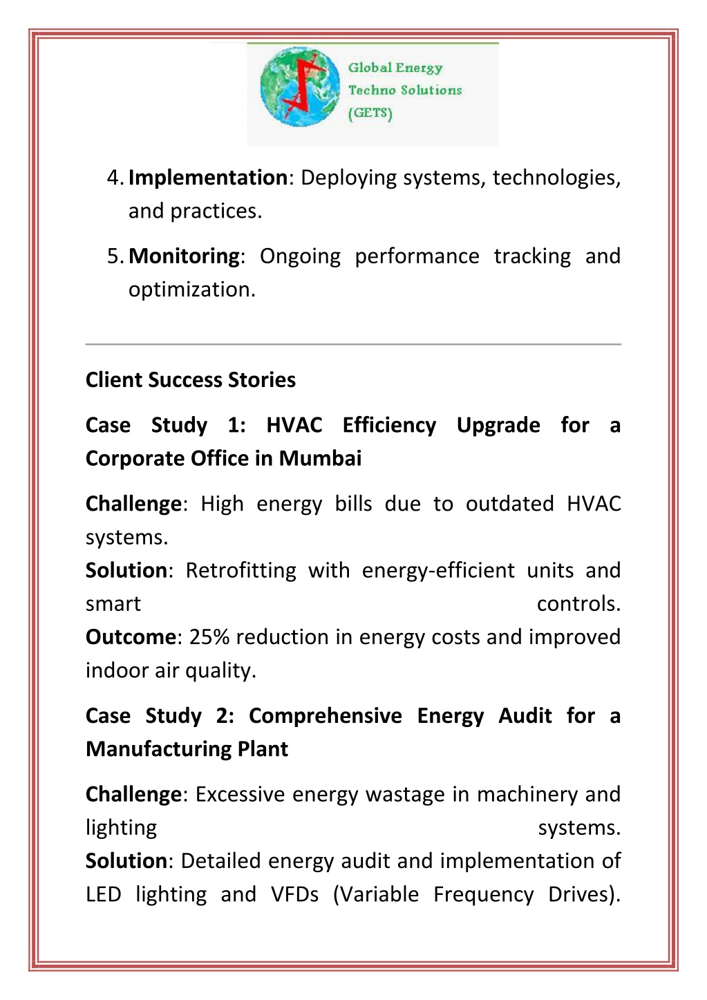 4.Implementation: Deploying systems, technologies, and practices. 5.Monitoring: Ongoing performance tracking and optimization. Client Success Stories Case Study 1: HVAC Efficiency Upgrade for a Corporate Office in Mumbai Challenge: High energy bills due to outdated HVAC systems. Solution: Retrofitting with energy-efficient units and smart Outcome: 25% reduction in energy costs and improved indoor air quality. controls. Case Study 2: Comprehensive Energy Audit for a Manufacturing Plant Challenge: Excessive energy wastage in machinery and lighting Solution: Detailed energy audit and implementation of LED lighting and VFDs (Variable Frequency Drives). systems.