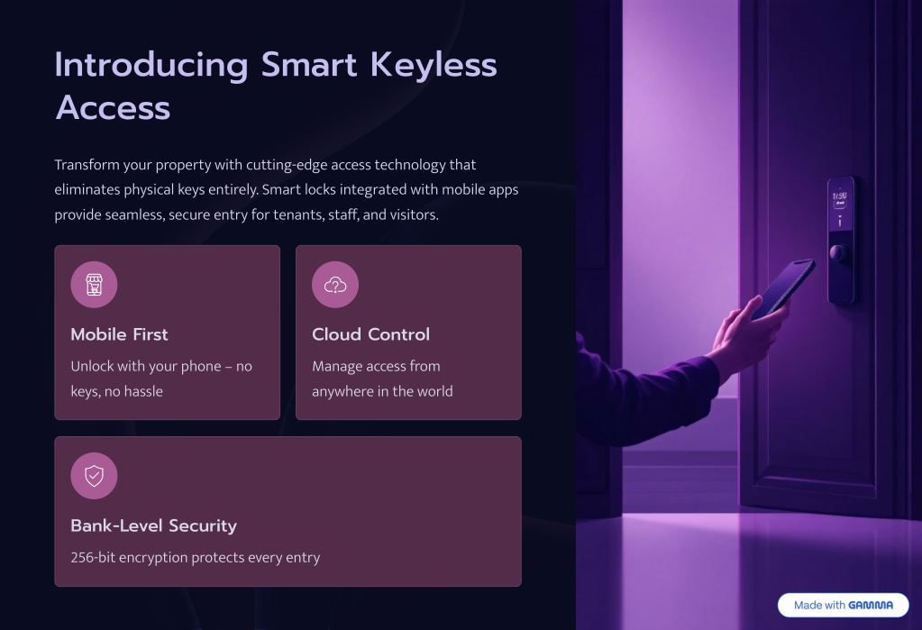 3. Introducing Smart Keyless Access Transform your property with cutting-edge access technology that eliminates physical keys entirely. Smart locks integrated with mobile apps provide seamless, secure entry for tenants, staff, and visitors. Mobile First Unlock with your phone 3 no keys, no hassle Cloud Control Manage access from anywhere in the world Bank-Level Security 256-bit encryption protects every entry
