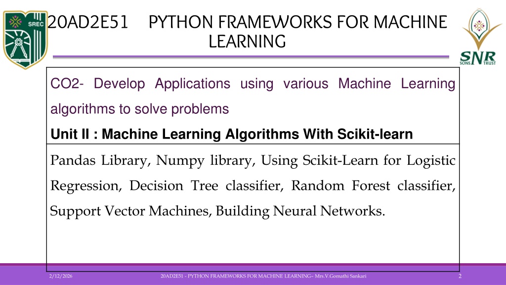 SRI RAMAKRISHNA ENGINEERING COLLEGE [Educational Service : SNR Sons Charitable Trust] [Autonomous Institution, Accredited by NAAC with ‘A’ Grade] [Approved by AICTE and Permanently Affiliated to Anna University, Chennai] [ISO 9001:2015 Certified and all Eligible Programmes Accredited by NBA] VATTAMALAIPALAYAM, N.G.G.O. COLONY POST, COIMBATORE – 641 022. Department of Artificial Intelligence and Data Science 20AD2E51 - PYTHON FRAMEWORKS FOR MACHINE LEARNING PRESENTATION BY Mrs.V.GomathiSankari ASSISTANT PROFESSOR/ AI&DS 20AD2E51 - PYTHON FRAMEWORKS FOR MACHINE LEARNING– Mrs.V.GomathiSankari