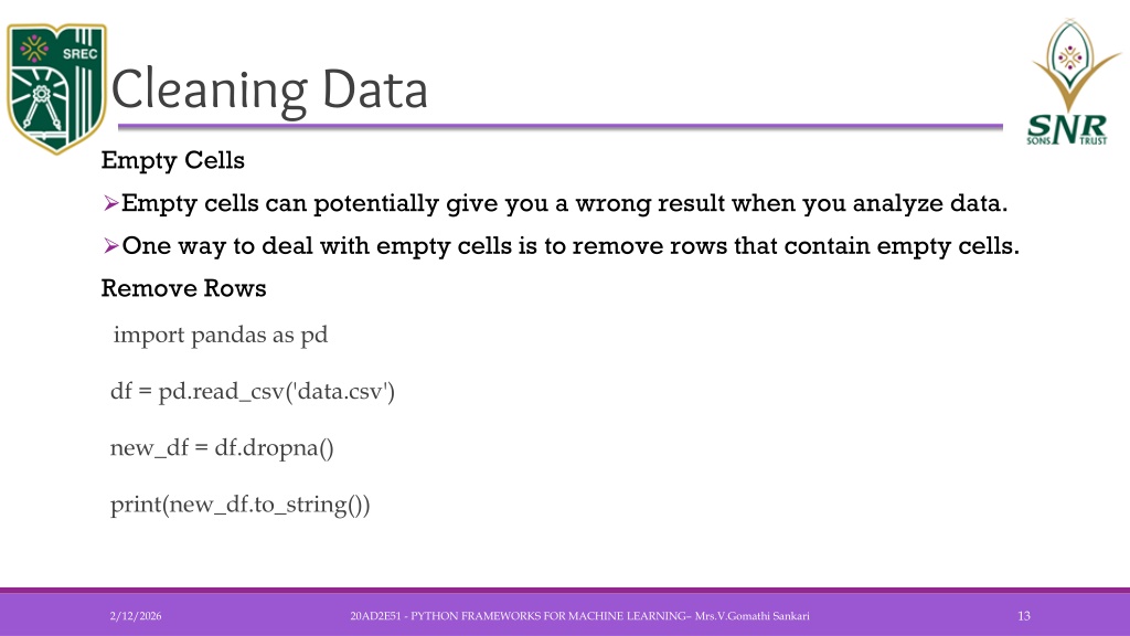 Cleaning Data Empty Cells • Empty cells can potentially give you a wrong result when you analyze data. • One way to deal with empty cells is to remove rows that contain empty cells. Remove Rows • import pandas as pddf = pd.read_csv('data.csv')new_df = df.dropna()print(new_df.to_string()) 20AD2E51 - PYTHON FRAMEWORKS FOR MACHINE LEARNING– Mrs.V.GomathiSankari
