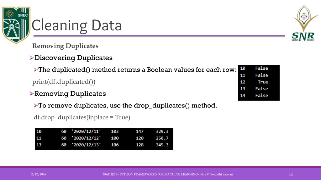 Cleaning Data • Removing Duplicates • Discovering Duplicates • The duplicated() method returns a Boolean values for each row: • print(df.duplicated()) • Removing Duplicates • To remove duplicates, use the drop_duplicates() method. df.drop_duplicates(inplace = True) 20AD2E51 - PYTHON FRAMEWORKS FOR MACHINE LEARNING– Mrs.V.GomathiSankari