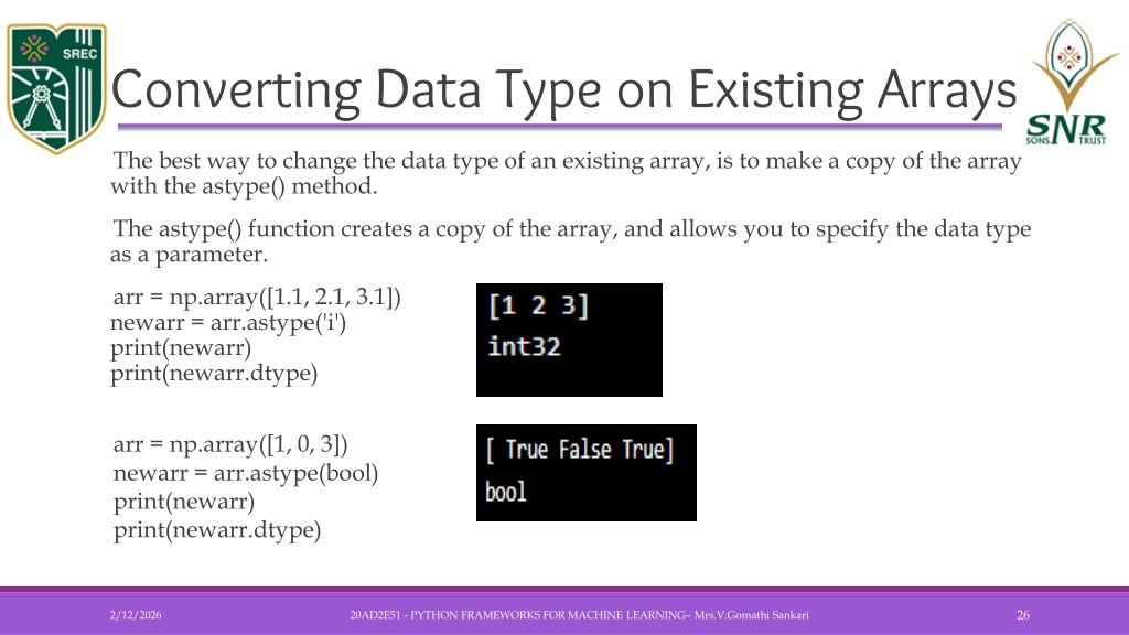 Creating Arrays With a Defined Data Type • import numpy as np • arr = np.array(['a', '2', '3'], dtype='i') 20AD2E51 - PYTHON FRAMEWORKS FOR MACHINE LEARNING– Mrs.V.GomathiSankari