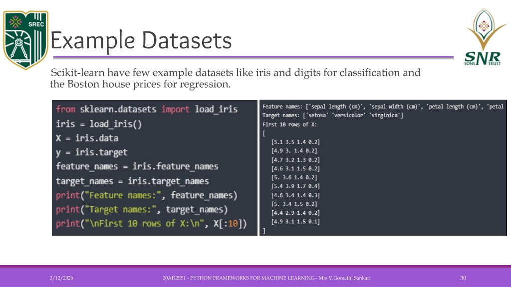 Example Datasets • Scikit-learn have few example datasets like iris and digits for classification and the Boston house prices for regression. 20AD2E51 - PYTHON FRAMEWORKS FOR MACHINE LEARNING– Mrs.V.GomathiSankari