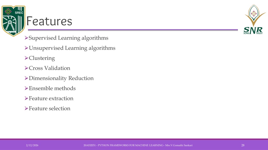 Features • Supervised Learning algorithms • Unsupervised Learning algorithms • Clustering • Cross Validation • Dimensionality Reduction • Ensemble methods • Feature extraction • Feature selection 20AD2E51 - PYTHON FRAMEWORKS FOR MACHINE LEARNING– Mrs.V.GomathiSankari