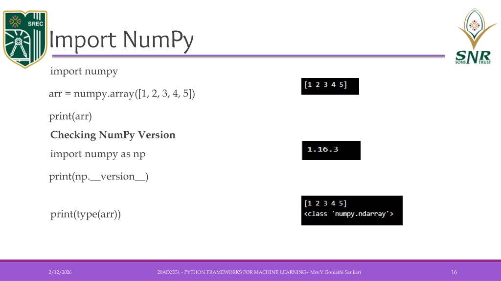 Import NumPy • import numpyarr = numpy.array([1, 2, 3, 4, 5])print(arr) • Checking NumPy Version • import numpy as npprint(np.__version__) • print(type(arr)) 20AD2E51 - PYTHON FRAMEWORKS FOR MACHINE LEARNING– Mrs.V.GomathiSankari