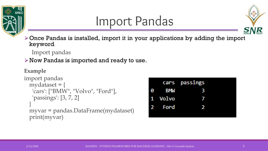 Import Pandas • Once Pandas is installed, import it in your applications by adding the import keyword: Import pandas • Now Pandas is imported and ready to use. Example import pandasmydataset = { 'cars': ["BMW", "Volvo", "Ford"], 'passings': [3, 7, 2]}myvar = pandas.DataFrame(mydataset)print(myvar) 20AD2E51 - PYTHON FRAMEWORKS FOR MACHINE LEARNING– Mrs.V.GomathiSankari