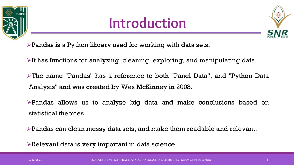 Introduction • Pandas is a Python library used for working with data sets. • It has functions for analyzing, cleaning, exploring, and manipulating data. • The name "Pandas" has a reference to both "Panel Data", and "Python Data Analysis" and was created by Wes McKinney in 2008. • Pandas allows us to analyze big data and make conclusions based on statistical theories. • Pandas can clean messy data sets, and make them readable and relevant. • Relevant data is very important in data science. 20AD2E51 - PYTHON FRAMEWORKS FOR MACHINE LEARNING– Mrs.V.GomathiSankari