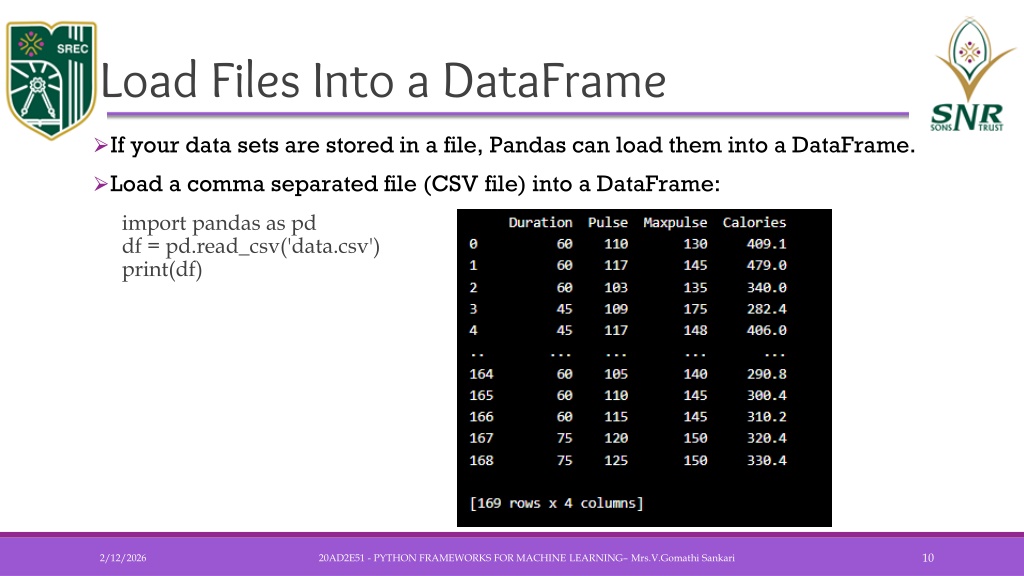 Load Files Into a DataFrame • If your data sets are stored in a file, Pandas can load them into a DataFrame. • Load a comma separated file (CSV file) into a DataFrame: • import pandas as pddf = pd.read_csv('data.csv')print(df) 20AD2E51 - PYTHON FRAMEWORKS FOR MACHINE LEARNING– Mrs.V.GomathiSankari