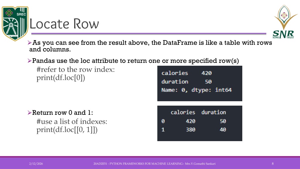 Locate Row • As you can see from the result above, the DataFrame is like a table with rows and columns. • Pandas use the loc attribute to return one or more specified row(s) #refer to the row index:print(df.loc[0]) • Return row 0 and 1: #use a list of indexes:print(df.loc[[0, 1]]) 20AD2E51 - PYTHON FRAMEWORKS FOR MACHINE LEARNING– Mrs.V.GomathiSankari