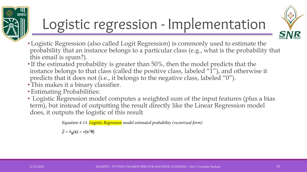 Logistic regression - Implementation • Logistic Regression (also called Logit Regression) is commonly used to estimate the probability that an instance belongs to a particular class (e.g., what is the probability that this email is spam?). • If the estimated probability is greater than 50%, then the model predicts that the instance belongs to that class (called the positive class, labeled “1”), and otherwise it predicts that it does not (i.e., it belongs to the negative class, labeled “0”). • This makes it a binary classifier. • Estimating Probabilities: • Logistic Regression model computes a weighted sum of the input features (plus a bias term), but instead of outputting the result directly like the Linear Regression model does, it outputs the logistic of this result 20AD2E51 - PYTHON FRAMEWORKS FOR MACHINE LEARNING– Mrs.V.GomathiSankari