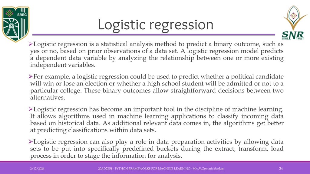 Logistic regression • Logistic regression is a statistical analysis method to predict a binary outcome, such as yes or no, based on prior observations of a data set. A logistic regression model predicts a dependent data variable by analyzing the relationship between one or more existing independent variables. • For example, a logistic regression could be used to predict whether a political candidate will win or lose an election or whether a high school student will be admitted or not to a particular college. These binary outcomes allow straightforward decisions between two alternatives. • Logistic regression has become an important tool in the discipline of machine learning. It allows algorithms used in machine learning applications to classify incoming data based on historical data. As additional relevant data comes in, the algorithms get better at predicting classifications within data sets. • Logistic regression can also play a role in data preparation activities by allowing data sets to be put into specifically predefined buckets during the extract, transform, load process in order to stage the information for analysis. 20AD2E51 - PYTHON FRAMEWORKS FOR MACHINE LEARNING– Mrs.V.GomathiSankari