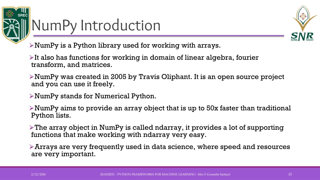 NumPy Introduction • NumPy is a Python library used for working with arrays. • It also has functions for working in domain of linear algebra, fourier transform, and matrices. • NumPy was created in 2005 by Travis Oliphant. It is an open source project and you can use it freely. • NumPy stands for Numerical Python. • NumPy aims to provide an array object that is up to 50x faster than traditional Python lists. • The array object in NumPy is called ndarray, it provides a lot of supporting functions that make working with ndarray very easy. • Arrays are very frequently used in data science, where speed and resources are very important. 20AD2E51 - PYTHON FRAMEWORKS FOR MACHINE LEARNING– Mrs.V.GomathiSankari