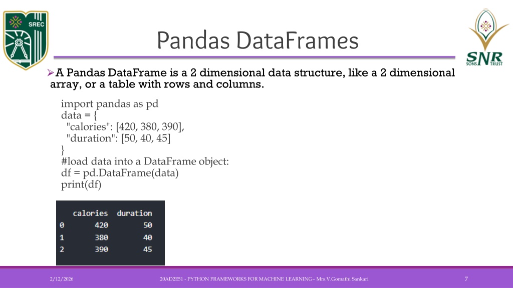 Pandas DataFrames • A Pandas DataFrame is a 2 dimensional data structure, like a 2 dimensional array, or a table with rows and columns. • import pandas as pddata = { "calories": [420, 380, 390], "duration": [50, 40, 45]}#load data into a DataFrame object:df = pd.DataFrame(data)print(df) 20AD2E51 - PYTHON FRAMEWORKS FOR MACHINE LEARNING– Mrs.V.GomathiSankari