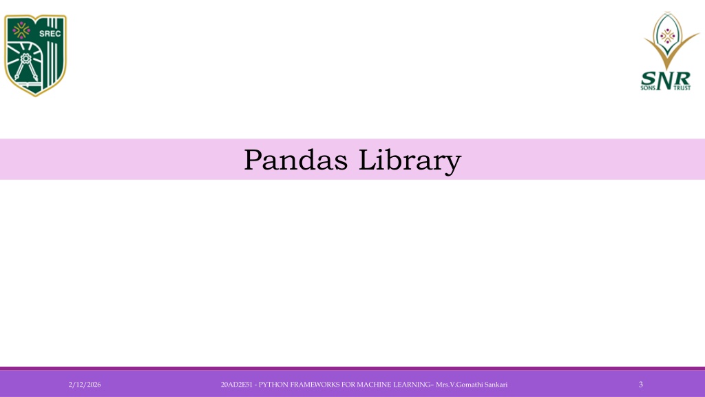 Pandas Library 20AD2E51 - PYTHON FRAMEWORKS FOR MACHINE LEARNING– Mrs.V.GomathiSankari