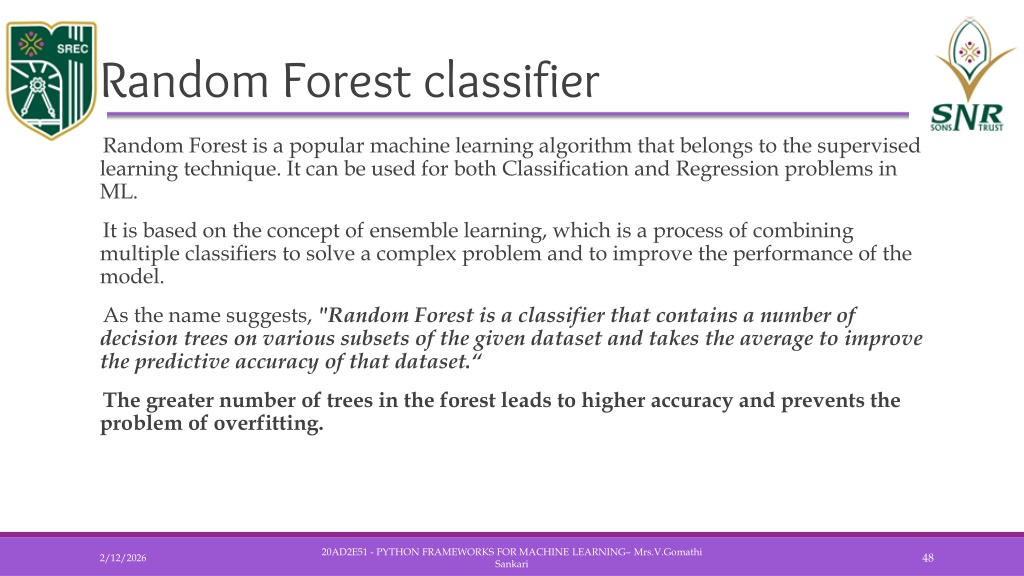 Random Forest classifier • Random Forest is a popular machine learning algorithm that belongs to the supervised learning technique. It can be used for both Classification and Regression problems in ML. • It is based on the concept of ensemble learning, which is a process of combining multiple classifiers to solve a complex problem and to improve the performance of the model. • As the name suggests, "Random Forest is a classifier that contains a number of decision trees on various subsets of the given dataset and takes the average to improve the predictive accuracy of that dataset.“ • The greater number of trees in the forest leads to higher accuracy and prevents the problem of overfitting. 20AD2E51 - PYTHON FRAMEWORKS FOR MACHINE LEARNING– Mrs.V.Gomathi Sankari