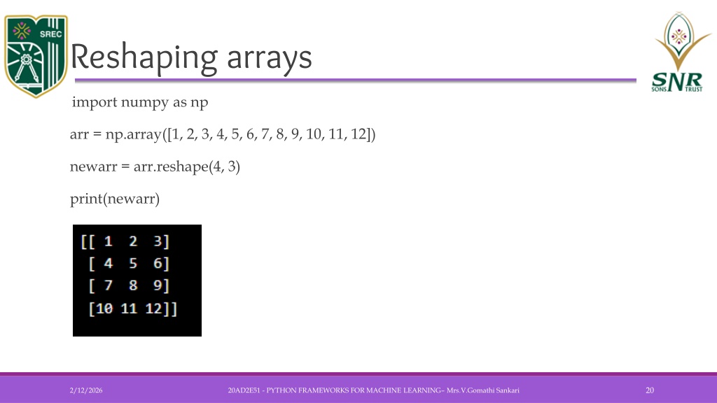 Reshaping arrays • import numpy as nparr = np.array([1, 2, 3, 4, 5, 6, 7, 8, 9, 10, 11, 12])newarr = arr.reshape(4, 3)print(newarr) 20AD2E51 - PYTHON FRAMEWORKS FOR MACHINE LEARNING– Mrs.V.GomathiSankari
