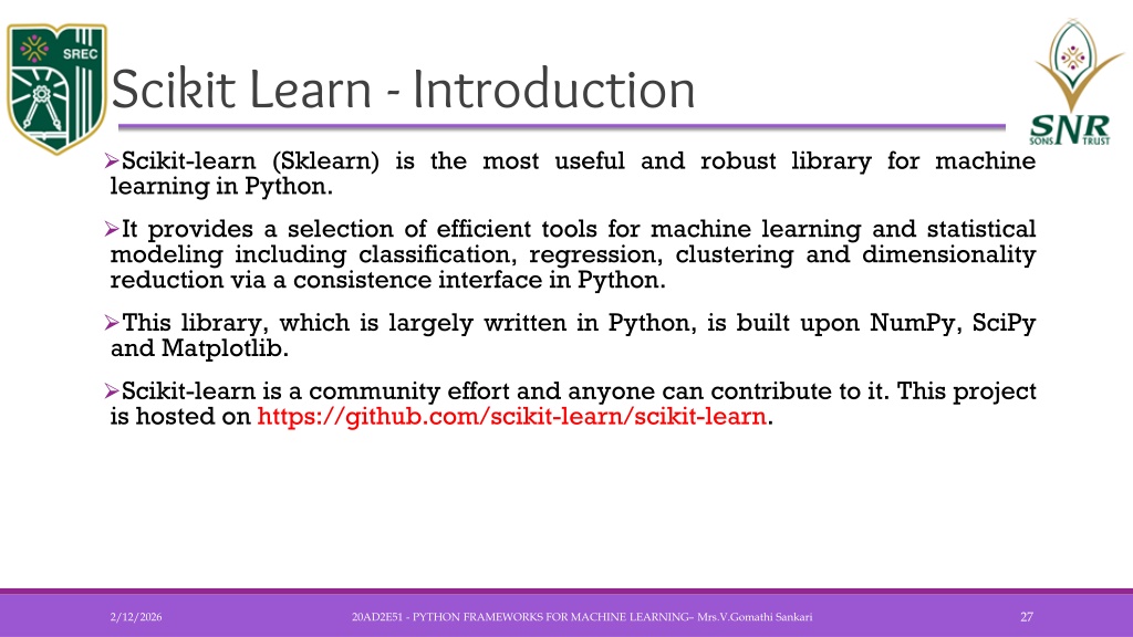Scikit Learn - Introduction • Scikit-learn (Sklearn) is the most useful and robust library for machine learning in Python. • It provides a selection of efficient tools for machine learning and statistical modeling including classification, regression, clustering and dimensionality reduction via a consistence interface in Python. • This library, which is largely written in Python, is built upon NumPy, SciPy and Matplotlib. • Scikit-learn is a community effort and anyone can contribute to it. This project is hosted on https://github.com/scikit-learn/scikit-learn. 20AD2E51 - PYTHON FRAMEWORKS FOR MACHINE LEARNING– Mrs.V.GomathiSankari