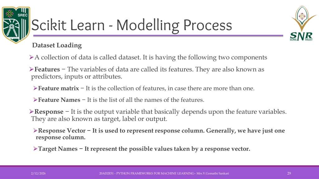 Scikit Learn - Modelling Process • Dataset Loading • A collection of data is called dataset. It is having the following two components • Features − The variables of data are called its features. They are also known as predictors, inputs or attributes. • Feature matrix − It is the collection of features, in case there are more than one. • Feature Names − It is the list of all the names of the features. • Response − It is the output variable that basically depends upon the feature variables. They are also known as target, label or output. • Response Vector − It is used to represent response column. Generally, we have just one response column. • Target Names − It represent the possible values taken by a response vector. 20AD2E51 - PYTHON FRAMEWORKS FOR MACHINE LEARNING– Mrs.V.GomathiSankari