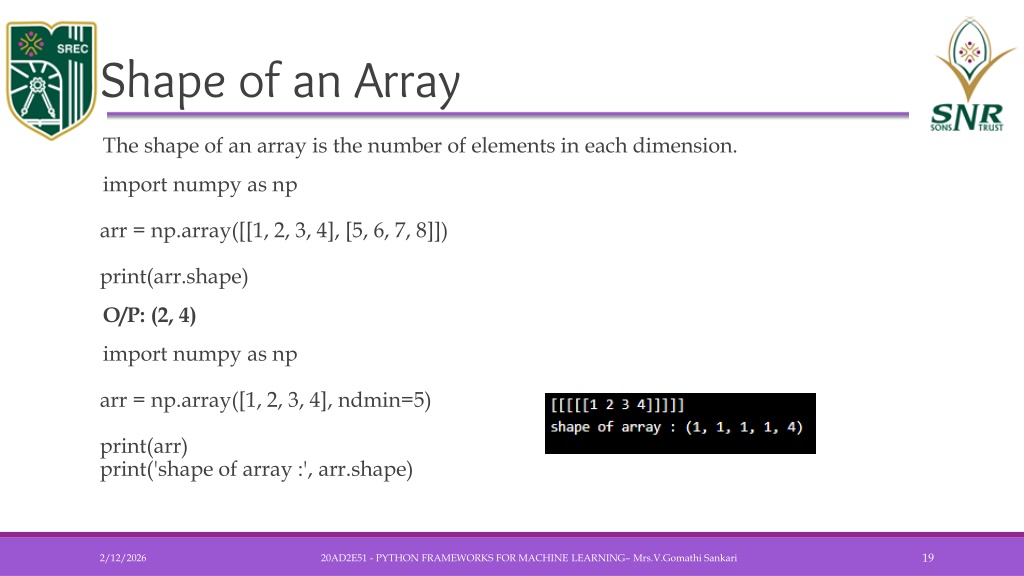 Shape of an Array • The shape of an array is the number of elements in each dimension. • import numpy as nparr = np.array([[1, 2, 3, 4], [5, 6, 7, 8]])print(arr.shape) • O/P: (2, 4) • import numpy as nparr = np.array([1, 2, 3, 4], ndmin=5)print(arr)print('shape of array :', arr.shape) 20AD2E51 - PYTHON FRAMEWORKS FOR MACHINE LEARNING– Mrs.V.GomathiSankari