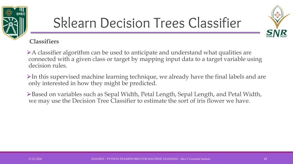 Sklearn Decision Trees Classifier • Classifiers • A classifier algorithm can be used to anticipate and understand what qualities are connected with a given class or target by mapping input data to a target variable using decision rules. • In this supervised machine learning technique, we already have the final labels and are only interested in how they might be predicted. • Based on variables such as Sepal Width, Petal Length, Sepal Length, and Petal Width, we may use the Decision Tree Classifier to estimate the sort of iris flower we have. 20AD2E51 - PYTHON FRAMEWORKS FOR MACHINE LEARNING– Mrs.V.GomathiSankari