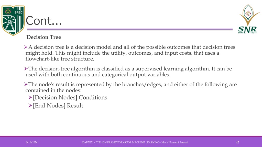Cont… • Decision Tree • A decision tree is a decision model and all of the possible outcomes that decision trees might hold. This might include the utility, outcomes, and input costs, that uses a flowchart-like tree structure. • The decision-tree algorithm is classified as a supervised learning algorithm. It can be used with both continuous and categorical output variables. • The node's result is represented by the branches/edges, and either of the following are contained in the nodes: • [Decision Nodes] Conditions • [End Nodes] Result 20AD2E51 - PYTHON FRAMEWORKS FOR MACHINE LEARNING– Mrs.V.GomathiSankari
