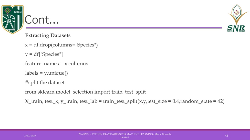 Cont… • Extracting Datasets • x = df.drop(columns="Species") • y = df["Species"] • feature_names = x.columns • labels = y.unique() • #split the dataset • from sklearn.model_selection import train_test_split • X_train, test_x, y_train, test_lab = train_test_split(x,y,test_size = 0.4,random_state = 42) 20AD2E51 - PYTHON FRAMEWORKS FOR MACHINE LEARNING– Mrs.V.Gomathi Sankari