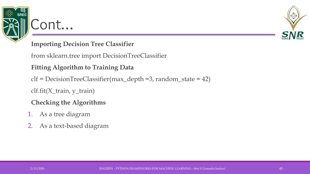 Cont… • Importing Decision Tree Classifier • from sklearn.tree import DecisionTreeClassifier • Fitting Algorithm to Training Data • clf = DecisionTreeClassifier(max_depth =3, random_state = 42) • clf.fit(X_train, y_train) • Checking the Algorithms • As a tree diagram • As a text-based diagram 20AD2E51 - PYTHON FRAMEWORKS FOR MACHINE LEARNING– Mrs.V.GomathiSankari