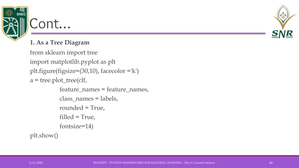 Cont… • 1. As a Tree Diagram • from sklearn import tree • import matplotlib.pyplot as plt • plt.figure(figsize=(30,10), facecolor ='k') • a = tree.plot_tree(clf, • feature_names = feature_names, • class_names = labels, • rounded = True, • filled = True, • fontsize=14) • plt.show() 20AD2E51 - PYTHON FRAMEWORKS FOR MACHINE LEARNING– Mrs.V.GomathiSankari
