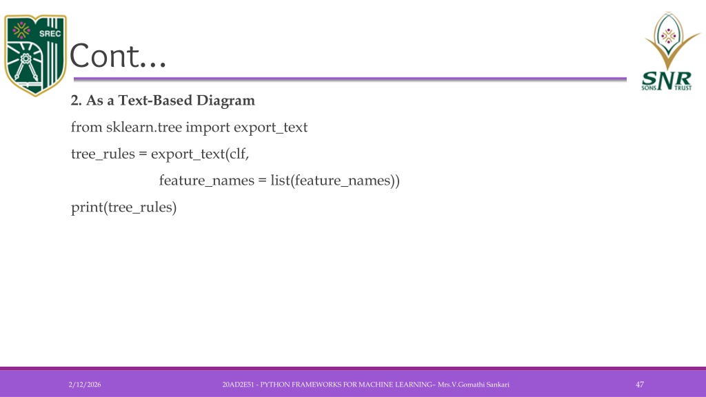 Cont… • 2. As a Text-Based Diagram • from sklearn.tree import export_text • tree_rules = export_text(clf, • feature_names = list(feature_names)) • print(tree_rules) 20AD2E51 - PYTHON FRAMEWORKS FOR MACHINE LEARNING– Mrs.V.GomathiSankari
