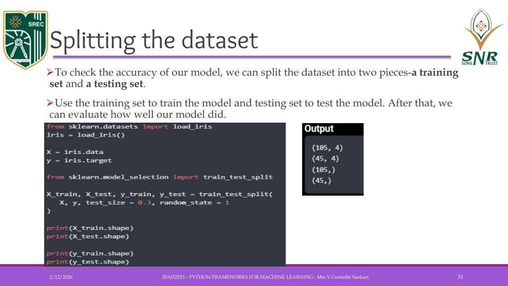 Cont… • As seen in the example above, it uses train_test_split() function of scikit-learn to split the dataset. This function has the following arguments − • X, y − Here, X is the feature matrix and y is the response vector, which need to be split. • test_size − This represents the ratio of test data to the total given data. As in the above example, we are setting test_data = 0.3 for 150 rows of X. It will produce test data of 150*0.3 = 45 rows. • random_size − It is used to guarantee that the split will always be the same. This is useful in the situations where you want reproducible results. 20AD2E51 - PYTHON FRAMEWORKS FOR MACHINE LEARNING– Mrs.V.GomathiSankari