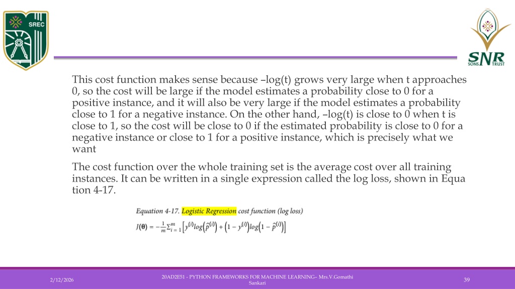 This cost function makes sense because –log(t) grows very large when t approaches 0, so the cost will be large if the model estimates a probability close to 0 for a positive instance, and it will also be very large if the model estimates a probability close to 1 for a negative instance. On the other hand, –log(t) is close to 0 when t is close to 1, so the cost will be close to 0 if the estimated probability is close to 0 for a negative instance or close to 1 for a positive instance, which is precisely what we want • The cost function over the whole training set is the average cost over all training instances. It can be written in a single expression called the log loss, shown in Equation 4-17. 20AD2E51 - PYTHON FRAMEWORKS FOR MACHINE LEARNING– Mrs.V.Gomathi Sankari