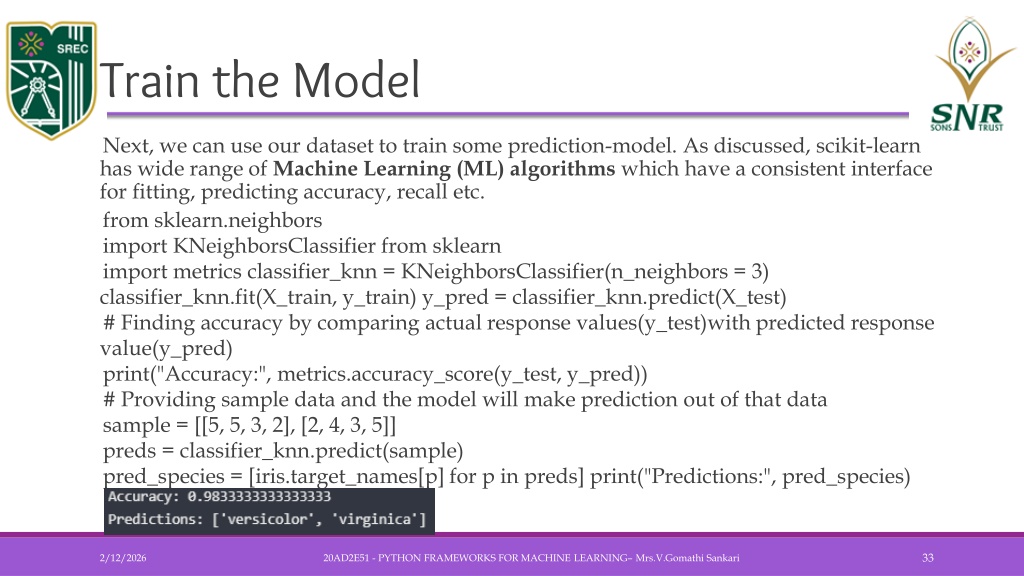 Train the Model • Next, we can use our dataset to train some prediction-model. As discussed, scikit-learn has wide range of Machine Learning (ML) algorithms which have a consistent interface for fitting, predicting accuracy, recall etc. • from sklearn.neighbors • import KNeighborsClassifier from sklearn • import metrics classifier_knn = KNeighborsClassifier(n_neighbors = 3) classifier_knn.fit(X_train, y_train) y_pred = classifier_knn.predict(X_test) • # Finding accuracy by comparing actual response values(y_test)with predicted response value(y_pred) • print("Accuracy:", metrics.accuracy_score(y_test, y_pred)) • # Providing sample data and the model will make prediction out of that data • sample = [[5, 5, 3, 2], [2, 4, 3, 5]] • preds = classifier_knn.predict(sample) • pred_species = [iris.target_names[p] for p in preds] print("Predictions:", pred_species) 20AD2E51 - PYTHON FRAMEWORKS FOR MACHINE LEARNING– Mrs.V.GomathiSankari