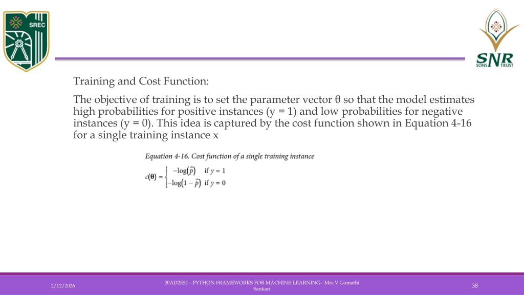 Training and Cost Function: • The objective of training is to set the parameter vector θ so that the model estimates high probabilities for positive instances (y = 1) and low probabilities for negative instances (y = 0). This idea is captured by the cost function shown in Equation 4-16 for a single training instance x 20AD2E51 - PYTHON FRAMEWORKS FOR MACHINE LEARNING– Mrs.V.Gomathi Sankari