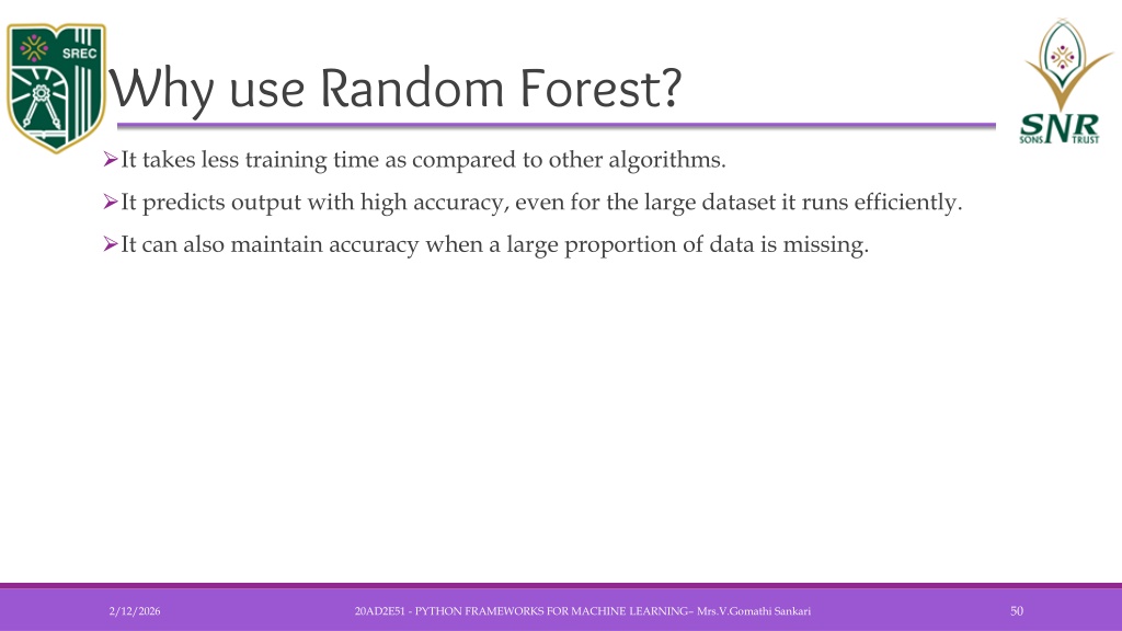 Why use Random Forest? • It takes less training time as compared to other algorithms. • It predicts output with high accuracy, even for the large dataset it runs efficiently. • It can also maintain accuracy when a large proportion of data is missing. 20AD2E51 - PYTHON FRAMEWORKS FOR MACHINE LEARNING– Mrs.V.GomathiSankari