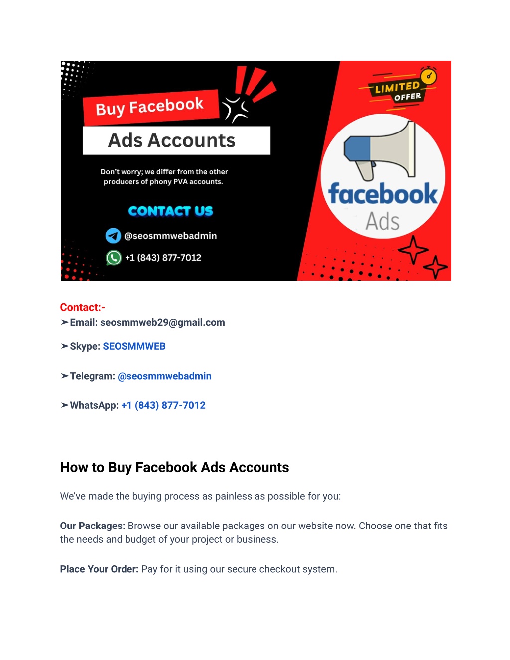 Contact:- ➤Email: seosmmweb29@gmail.com ➤Skype: SEOSMMWEB ➤Telegram: @seosmmwebadmin ➤WhatsApp: +1 (843) 877-7012 How to Buy Facebook Ads Accounts We’ve made the buying process as painless as possible for you: Our Packages: Browse our available packages on our website now. Choose one that fits the needs and budget of your project or business. Place Your Order: Pay for it using our secure checkout system.