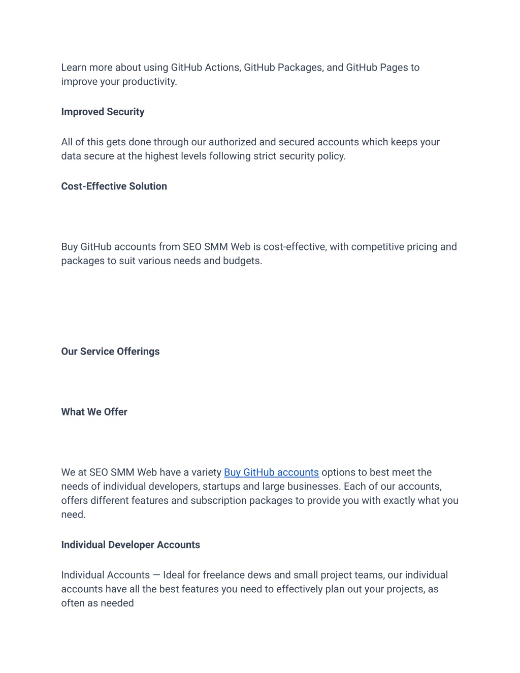 Learn more about using GitHub Actions, GitHub Packages, and GitHub Pages to improve your productivity. Improved Security All of this gets done through our authorized and secured accounts which keeps your data secure at the highest levels following strict security policy. Cost-Effective Solution Buy GitHub accounts from SEO SMM Web is cost-effective, with competitive pricing and packages to suit various needs and budgets. Our Service Offerings What We Offer We at SEO SMM Web have a variety Buy GitHub accounts options to best meet the needs of individual developers, startups and large businesses. Each of our accounts, offers different features and subscription packages to provide you with exactly what you need. Individual Developer Accounts Individual Accounts — Ideal for freelance dews and small project teams, our individual accounts have all the best features you need to effectively plan out your projects, as often as needed