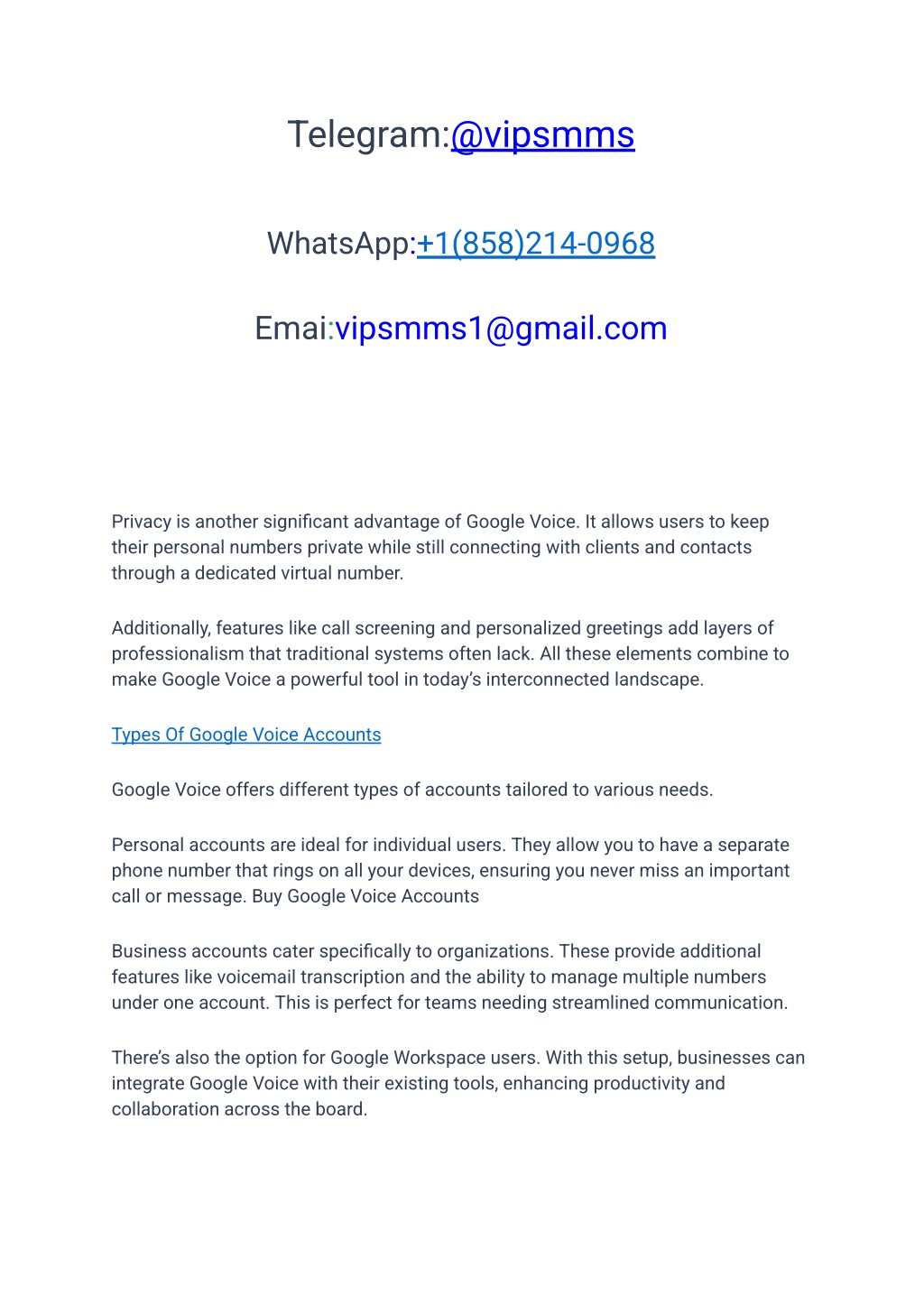 Telegram:@vipsmms WhatsApp:+1(858)214-0968 Emai:vipsmms1@gmail.com Privacy is another significant advantage of Google Voice. It allows users to keep their personal numbers private while still connecting with clients and contacts through a dedicated virtual number. Additionally, features like call screening and personalized greetings add layers of professionalism that traditional systems often lack. All these elements combine to make Google Voice a powerful tool in today’s interconnected landscape. Types Of Google Voice Accounts Google Voice offers different types of accounts tailored to various needs. Personal accounts are ideal for individual users. They allow you to have a separate phone number that rings on all your devices, ensuring you never miss an important call or message. Buy Google Voice Accounts Business accounts cater specifically to organizations. These provide additional features like voicemail transcription and the ability to manage multiple numbers under one account. This is perfect for teams needing streamlined communication. There’s also the option for Google Workspace users. With this setup, businesses can integrate Google Voice with their existing tools, enhancing productivity and collaboration across the board.