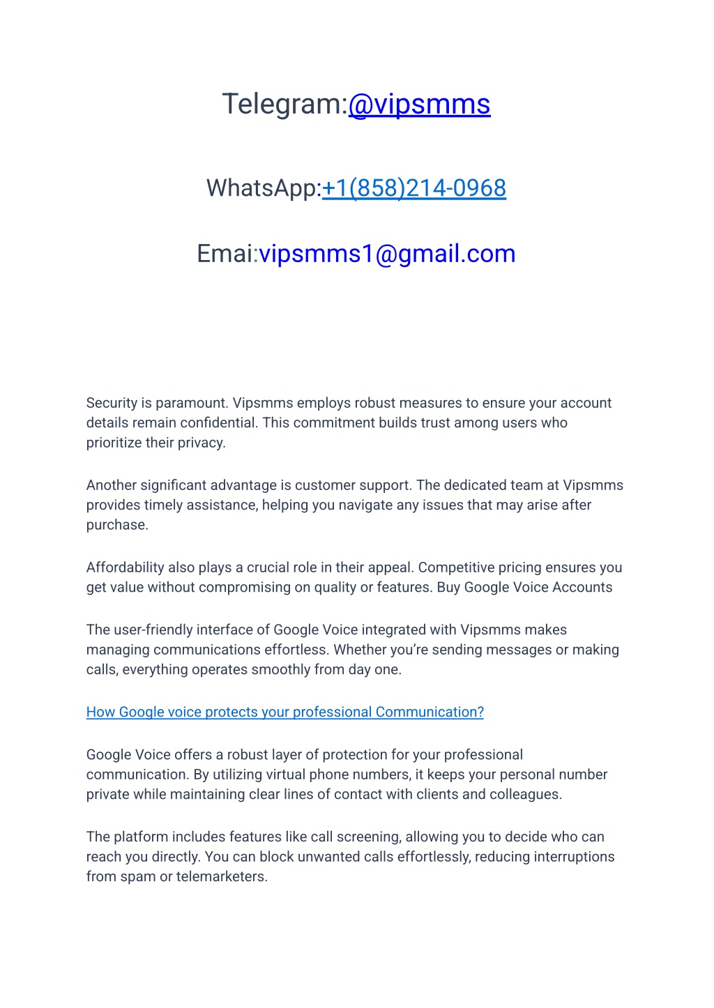 Telegram:@vipsmms WhatsApp:+1(858)214-0968 Emai:vipsmms1@gmail.com Security is paramount. Vipsmms employs robust measures to ensure your account details remain confidential. This commitment builds trust among users who prioritize their privacy. Another significant advantage is customer support. The dedicated team at Vipsmms provides timely assistance, helping you navigate any issues that may arise after purchase. Affordability also plays a crucial role in their appeal. Competitive pricing ensures you get value without compromising on quality or features. Buy Google Voice Accounts The user-friendly interface of Google Voice integrated with Vipsmms makes managing communications effortless. Whether you’re sending messages or making calls, everything operates smoothly from day one. How Google voice protects your professional Communication? Google Voice offers a robust layer of protection for your professional communication. By utilizing virtual phone numbers, it keeps your personal number private while maintaining clear lines of contact with clients and colleagues. The platform includes features like call screening, allowing you to decide who can reach you directly. You can block unwanted calls effortlessly, reducing interruptions from spam or telemarketers.