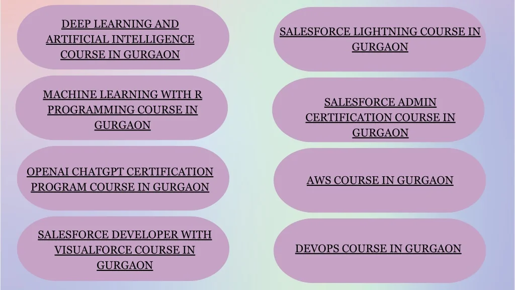 DEEP LEARNING AND ARTIFICIAL INTELLIGENCE COURSE IN GURGAON SALESFORCE LIGHTNING COURSE IN GURGAON MACHINE LEARNING WITH R PROGRAMMING COURSE IN GURGAON SALESFORCE ADMIN CERTIFICATION COURSE IN GURGAON OPENAI CHATGPT CERTIFICATION PROGRAM COURSE IN GURGAON AWS COURSE IN GURGAON SALESFORCE DEVELOPER WITH VISUALFORCE COURSE IN GURGAON DEVOPS COURSE IN GURGAON