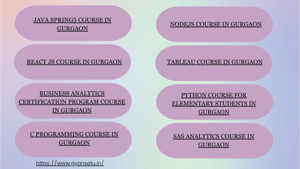 JAVA SPRING5 COURSE IN GURGAON NODEJS COURSE IN GURGAON REACT JS COURSE IN GURGAON TABLEAU COURSE IN GURGAON BUSINESS ANALYTICS CERTIFICATION PROGRAM COURSE IN GURGAON PYTHON COURSE FOR ELEMENTARY STUDENTS IN GURGAON C PROGRAMMING COURSE IN GURGAON SAS ANALYTICS COURSE IN GURGAON https://www.gyansetu.in/