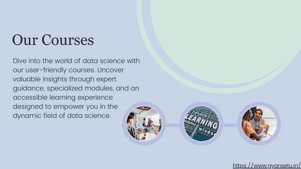 Our Courses Dive into the world of data science with our user-friendly courses. Uncover valuable insights through expert guidance, specialized modules, and an accessible learning experience designed to empower you in the dynamic field of data science. https://www.gyansetu.in/
