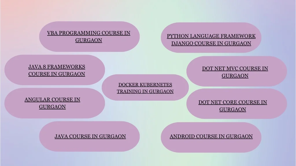 VBA PROGRAMMING COURSE IN GURGAON PYTHON LANGUAGE FRAMEWORK DJANGO COURSE IN GURGAON JAVA 8 FRAMEWORKS COURSE IN GURGAON DOT NET MVC COURSE IN GURGAON DOCKER KUBERNETES TRAINING IN GURGAON ANGULAR COURSE IN GURGAON DOT NET CORE COURSE IN GURGAON JAVA COURSE IN GURGAON ANDROID COURSE IN GURGAON