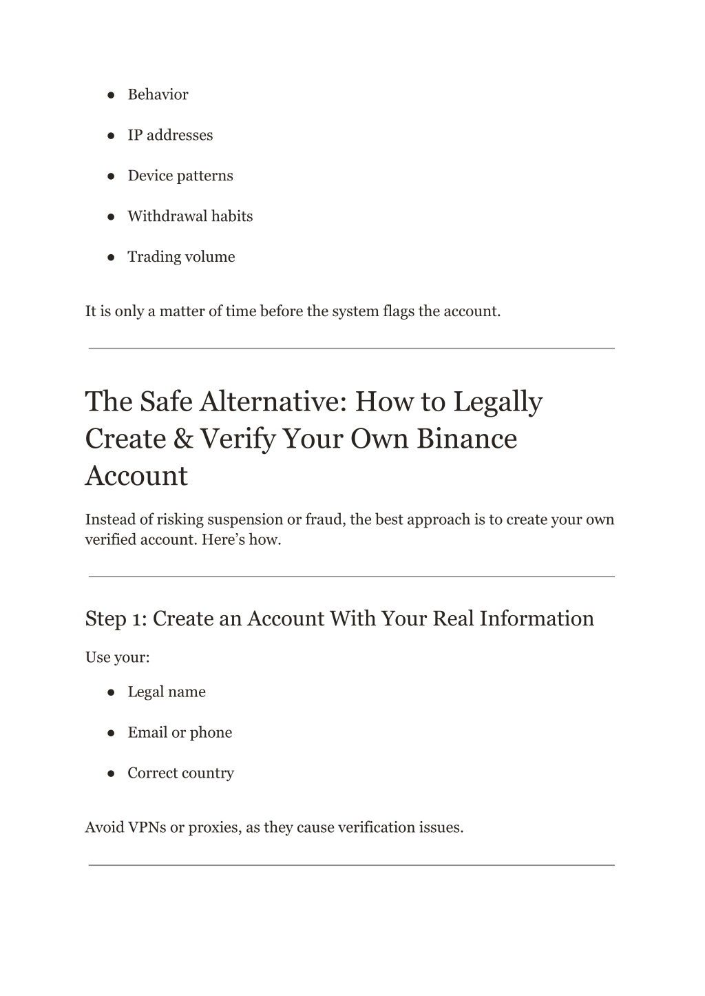 ● Behavior ● IP addresses ● Device patterns ● Withdrawal habits ● Trading volume It is only a matter of time before the system flags the account. The Safe Alternative: How to Legally Create & Verify Your Own Binance Account Instead of risking suspension or fraud, the best approach is to create your own verified account. Here’s how. Step 1: Create an Account With Your Real Information Use your: ● Legal name ● Email or phone ● Correct country Avoid VPNs or proxies, as they cause verification issues.