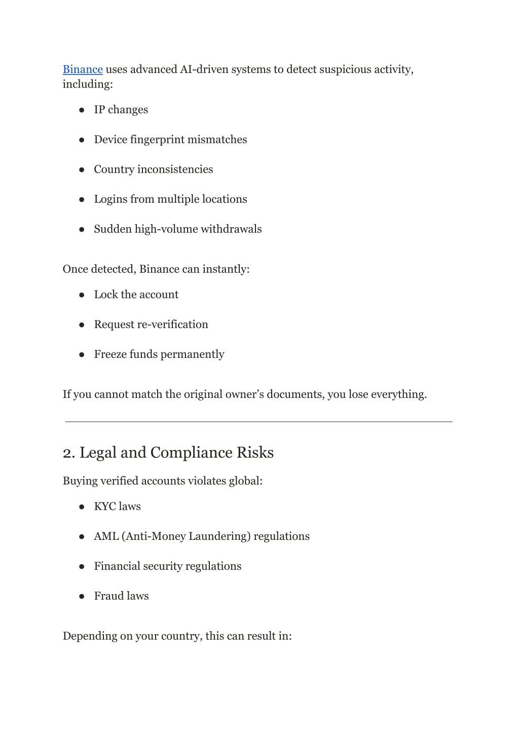 Binance uses advanced AI-driven systems to detect suspicious activity, including: ● IP changes ● Device fingerprint mismatches ● Country inconsistencies ● Logins from multiple locations ● Sudden high-volume withdrawals Once detected, Binance can instantly: ● Lock the account ● Request re-verification ● Freeze funds permanently If you cannot match the original owner’s documents, you lose everything. 2. Legal and Compliance Risks Buying verified accounts violates global: ● KYC laws ● AML (Anti-Money Laundering) regulations ● Financial security regulations ● Fraud laws Depending on your country, this can result in:
