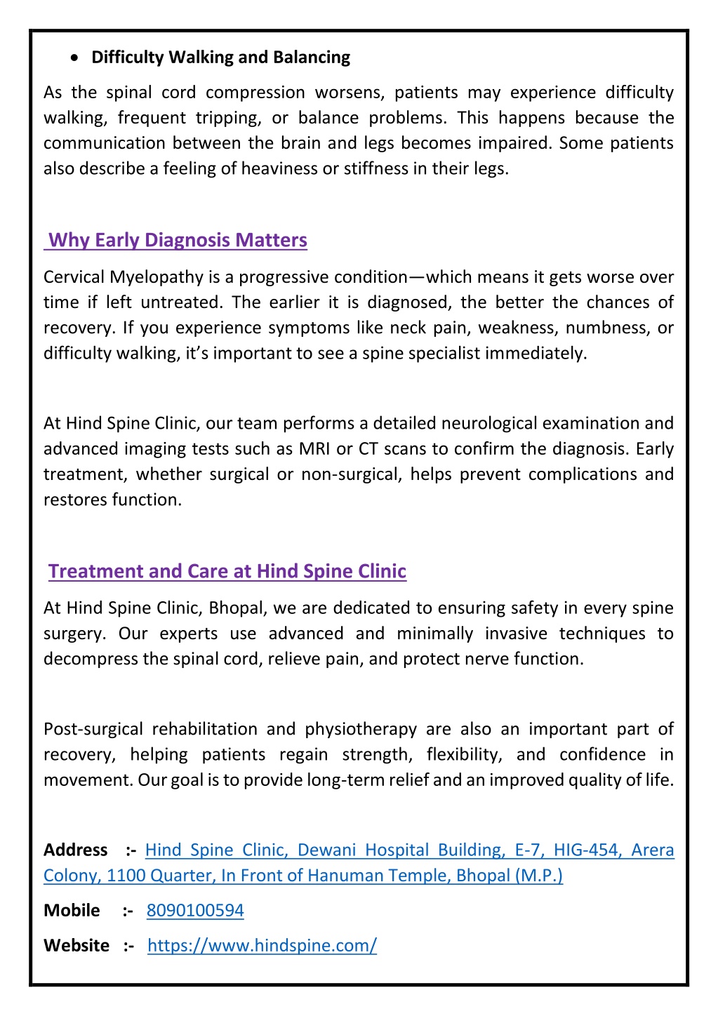 Difficulty Walking and Balancing As the spinal cord compression worsens, patients may experience difficulty walking, frequent tripping, or balance problems. This happens because the communication between the brain and legs becomes impaired. Some patients also describe a feeling of heaviness or stiffness in their legs. Why Early Diagnosis Matters Cervical Myelopathy is a progressive condition—which means it gets worse over time if left untreated. The earlier it is diagnosed, the better the chances of recovery. If you experience symptoms like neck pain, weakness, numbness, or difficulty walking, it’s important to see a spine specialist immediately. At Hind Spine Clinic, our team performs a detailed neurological examination and advanced imaging tests such as MRI or CT scans to confirm the diagnosis. Early treatment, whether surgical or non-surgical, helps prevent complications and restores function. Treatment and Care at Hind Spine Clinic At Hind Spine Clinic, Bhopal, we are dedicated to ensuring safety in every spine surgery. Our experts use advanced and minimally invasive techniques to decompress the spinal cord, relieve pain, and protect nerve function. Post-surgical rehabilitation and physiotherapy are also an important part of recovery, helping patients regain strength, flexibility, and confidence in movement. Our goal is to provide long-term relief and an improved quality of life. Address :- Hind Spine Clinic, Dewani Hospital Building, E-7, HIG-454, Arera Colony, 1100 Quarter, In Front of Hanuman Temple, Bhopal (M.P.) Mobile :- 8090100594 Website :- https://www.hindspine.com/