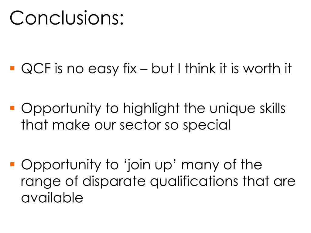11. Conclusions: • QCF is no easy fix – but I think it is worth it • Opportunity to highlight the unique skills that make our sector so special • Opportunity to ‘join up’ many of the range of disparate qualifications that are available