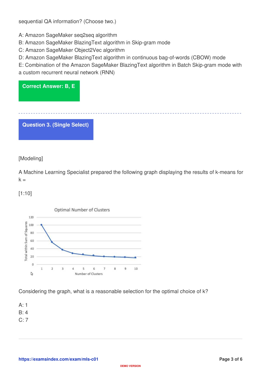 sequential QA information? (Choose two.) A: Amazon SageMaker seq2seq algorithm B: Amazon SageMaker BlazingText algorithm in Skip-gram mode C: Amazon SageMaker Object2Vec algorithm D: Amazon SageMaker BlazingText algorithm in continuous bag-of-words (CBOW) mode E: Combination of the Amazon SageMaker BlazingText algorithm in Batch Skip-gram mode with a custom recurrent neural network (RNN) Correct Answer: B, E Question 3. (Single Select) [Modeling] A Machine Learning Specialist prepared the following graph displaying the results of k-means for k = [1:10] Considering the graph, what is a reasonable selection for the optimal choice of k? A: 1 B: 4 C: 7 https://examsindex.com/exam/mls-c01 Page 3 of 6 DEMO VERSION